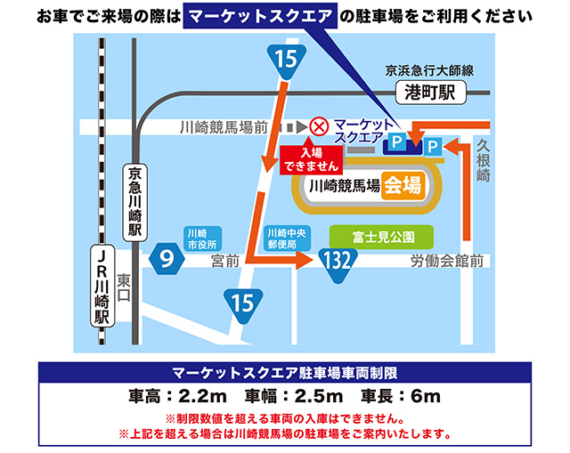 ※上記サイズ以上の車両でお越しの場合は川崎競馬場馬場内駐車場をご利用ください。