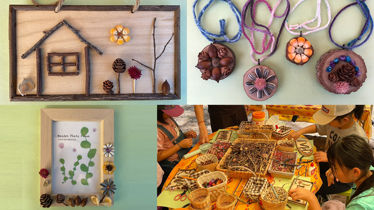 小枝やどんぐりなど自然の素材で自分だけのペンダント・フォトフレーム・ドアプレートを作ろう!文字にしたり絵にしたり表現は様々! 子供から大人まで夢中になってしまうこと間違いなしの体験です。